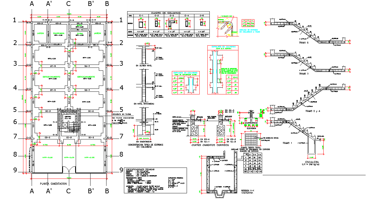 Foundation plan and section layout file, centre line plan detail, dimension detail, naming detail, staircase section detail, reinforcement detail, bolt nut detail, specification detail, table detail, section X-X’ detail, etc.