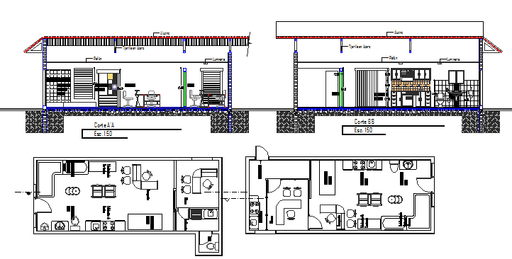 Mini shop sectional and layout plan details that includes a detailed view of front and back sectional view, roof view, doors and windows view, main entry gate, waiting and seating area, billing counter, general hall, sanitary facilities, front desk and much more of shop project.