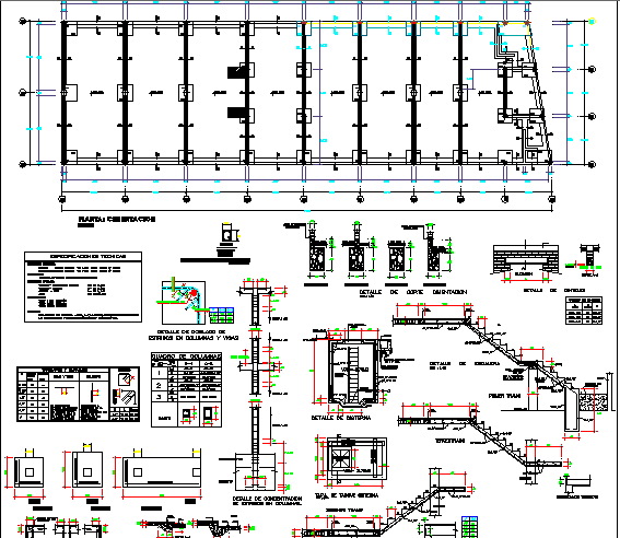Staircase and constructive details with foundation plan of shopping center dwg file