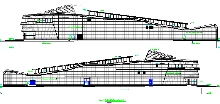 Front and back elevation view details of commercial cum shopping complex dwg file