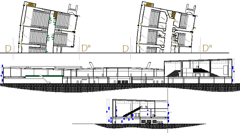 Shopping center elevation, section and floor plan details that includes a detailed view of front and back elevations, front and back sections, flooring view, tree view, car parking view, staircase view, doors and windows view, outdoor roads, indoor staircases, elevators, lifts, shops and showrooms, corporate offices, departmental stores, brand showrooms, retails market, stores, food stores, kids fun zone with shops and showrooms, departmental stores, theater, name hoarding and much more of shopping center project.