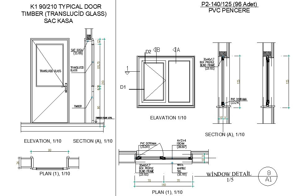 Window and door plan autocad file, elevation and section plan detail, section line detail, dimension detail, naming detail, scale 1:10 detail, etc.