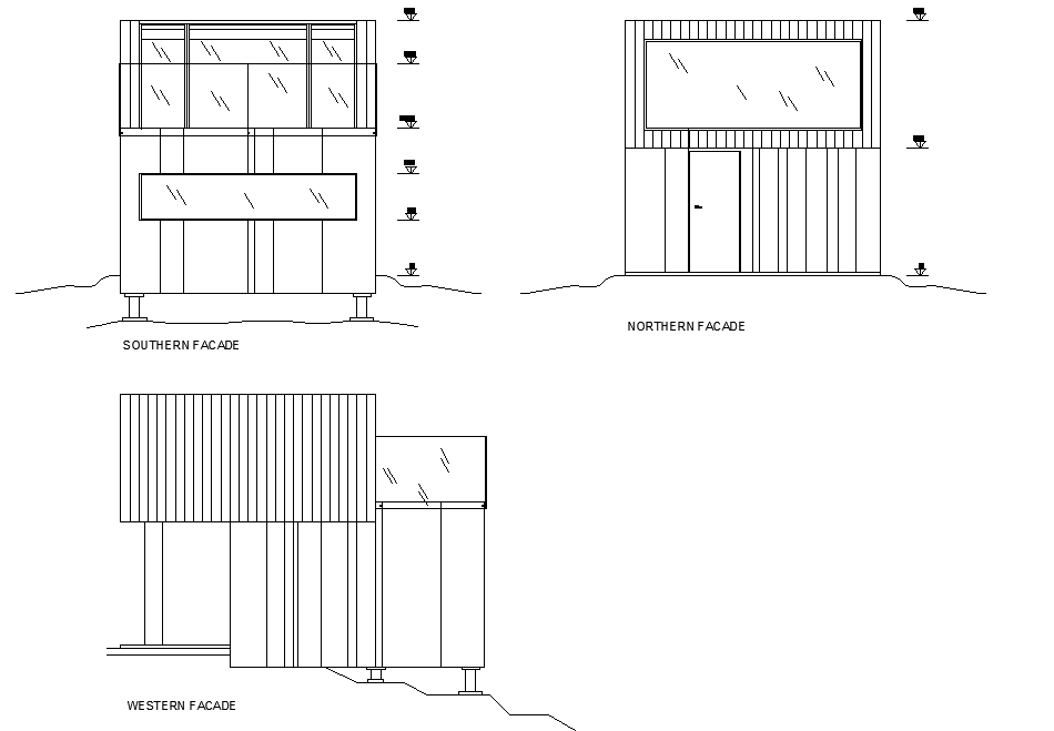 Detail elevation camping cabin layout file, north direction detail, west direction detail, south direction detail, leveling detail, hatching detail, foundation detail, etc.