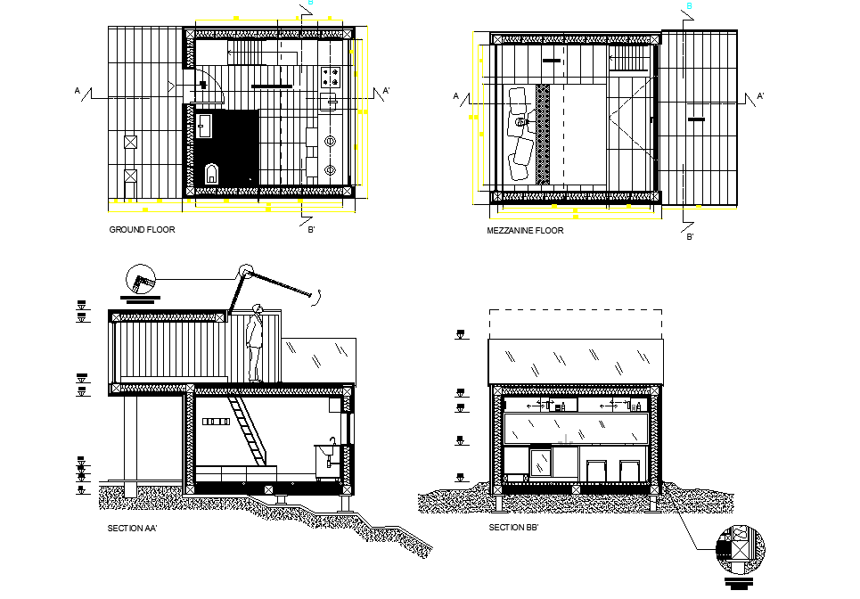 Plan and section camping cabin autocad file, section line detail, leveling detail, section A-A’ detail, section B-B’ detail, kitchen detail, hatching detail, etc.
