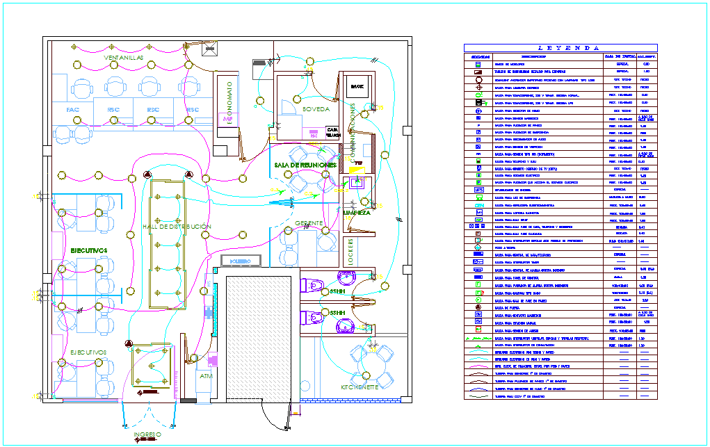 area distribution with wall and distribution of area and view of electrical line and installation view of electrical equipment with its legend with necessary detail.