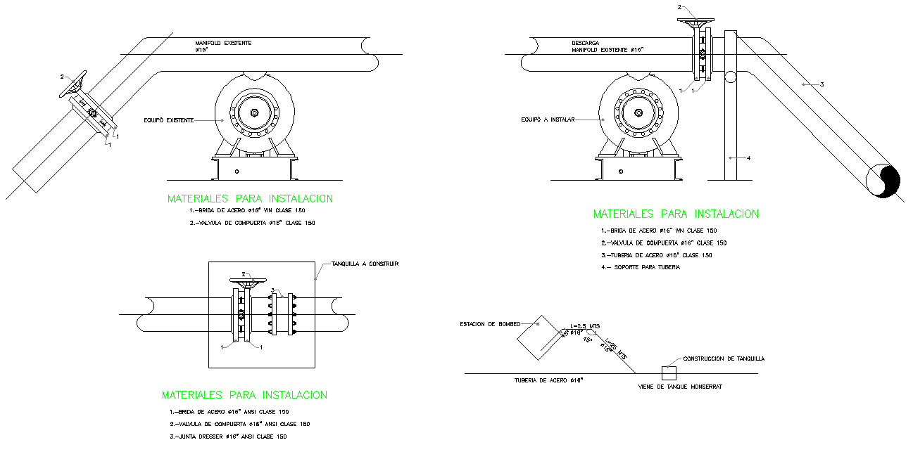 Pump installation detail dwg file, section plan detail, motor detail, dimension detail, naming detail, specification detail, section line detail, etc.