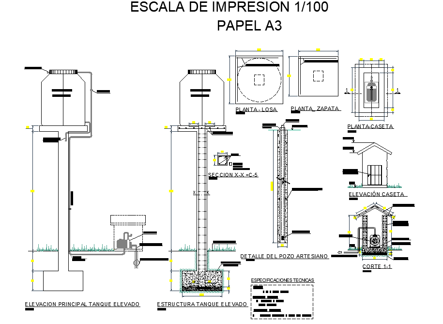Elevated tank detail dwg file, dimension detail, naming detail, foundation plan detail, reinforcement detail, bolt nut detail, column section plan detail, pipe line detail, motor detail, etc.