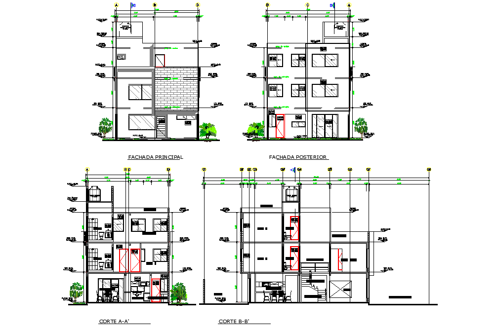 Elevation and section house layout file, centre line plan detail, front elevation detail, side elevation detail, section line detail, landscaping detail in tree and plant detail, furniture detail in door, window, table, chair and T.V unit detail, section A-A’ detail, section B-B’ detail, stair section plan detail, etc.