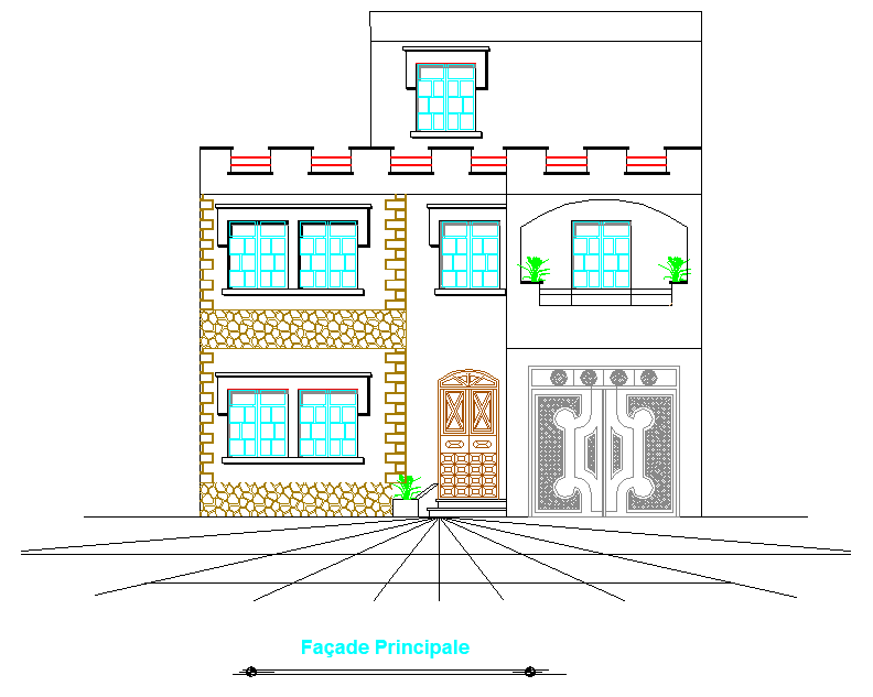 Isometric home plan autocad file, landscaping detail in tree and plant detail, front elevation detail, furniture detail in door and window detail, brick wall detail, parapet detail, etc.