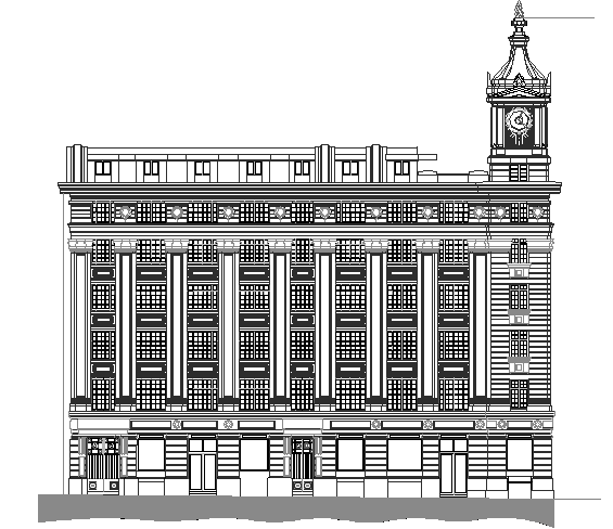 Back elevation view details of multi-flooring government building that includes a detailed view of back elevation, flooring view, doors and windows view, indoor and outdoor staircases, wall design, roof or terrace view, dome view, top decorative clock view and much more of government building elevation.
