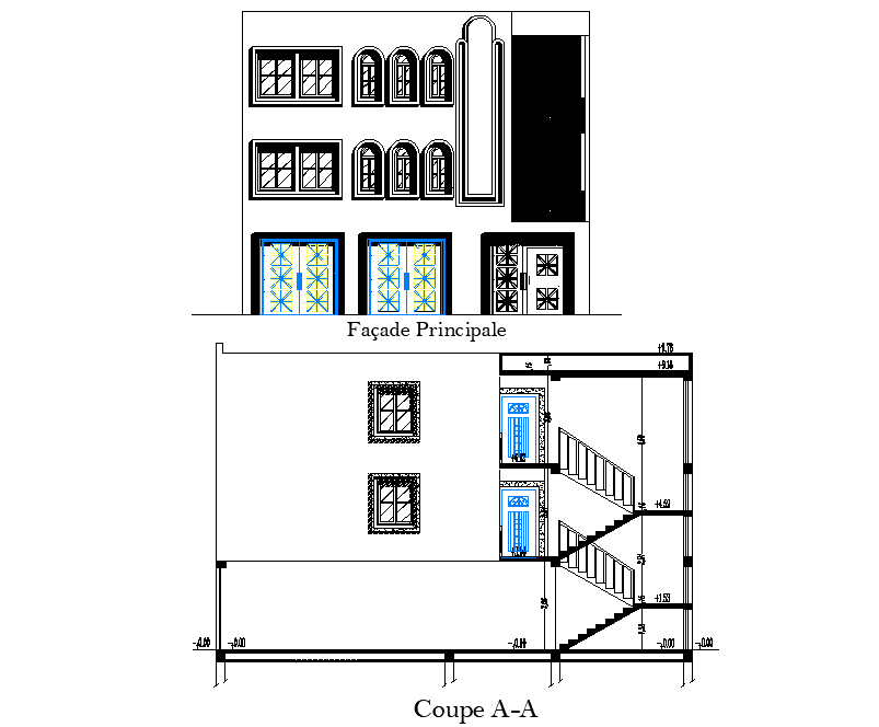 Elevation and section villa plan layout file, front elevation detail, section A-A’ detail, stair section detail, furniture detail in door and window detail, leveling detail, etc.