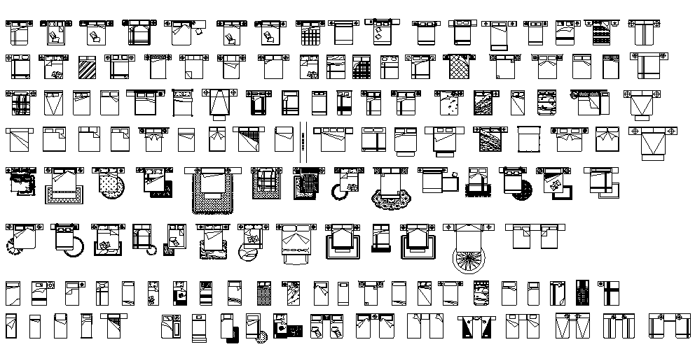 Bed plan dwg file. The top view plan of beds with different sizes, styles, like single bed, double bed. Plan with detailing of side units , bed, pillows, cad block, etc.,