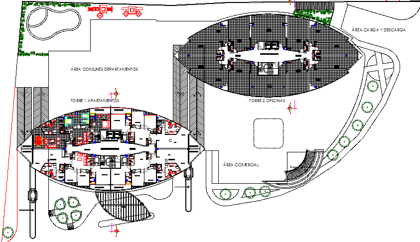 Floor plan architecture layout of corporate building that includes a detailed view of main entry and exit gate, landscaping view, tree view, mini garden, car parking view, reception area, waiting and section area, offices, employee desk, head offices, meeting room, conference hall, dining area, staff room, smoking zone, sanitary facilities, general hall, cleaning department and much more of building floor plan.