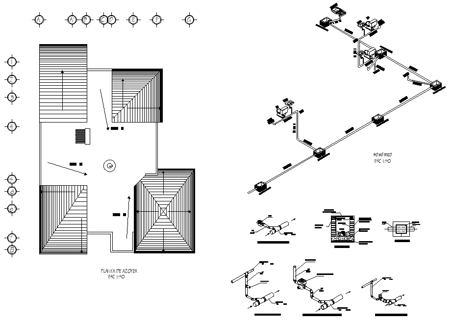 Water pipe line house terrace floor plan layout file, isometric circuit detail, centre line plan detail, hatching detail, main hole plan and section detail, pipe lock system detail, etc.