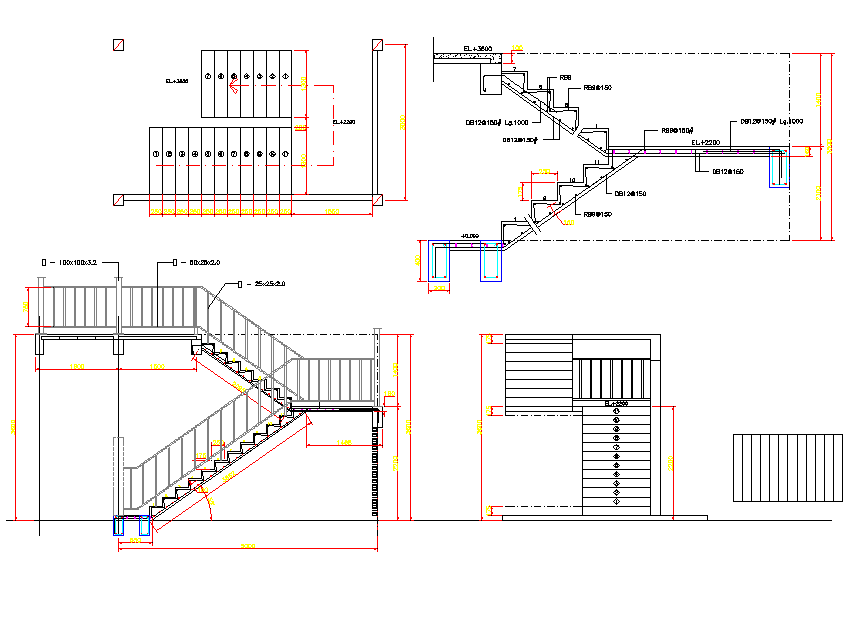 Concrete stairs plan. the top view plan with sectional detailing. Detailing of railing, dimensional detailing, etc.,