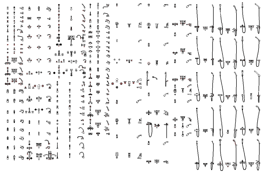Faucets plan. The plan with different patterns of faucets, with different dimensions and sizes. Wash basin faucet, shower area faucet, etc., are being shown in the plan.
