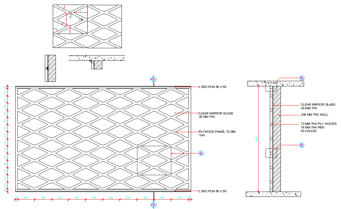 Interior wall design plan and section detail layout file, dimension detail, naming detail, section line detail, hatching detail, etc.