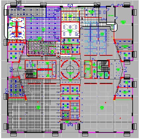 Third floor layout plan details of corporate office building that includes a detailed view of main entry gate, exit gate, waiting area, seating area, general hall, passage, corporate offices, meeting room, conference hall, computer desks, sanitary facilities, indoor doors, staircases, dining area and much more of office building floor plan.