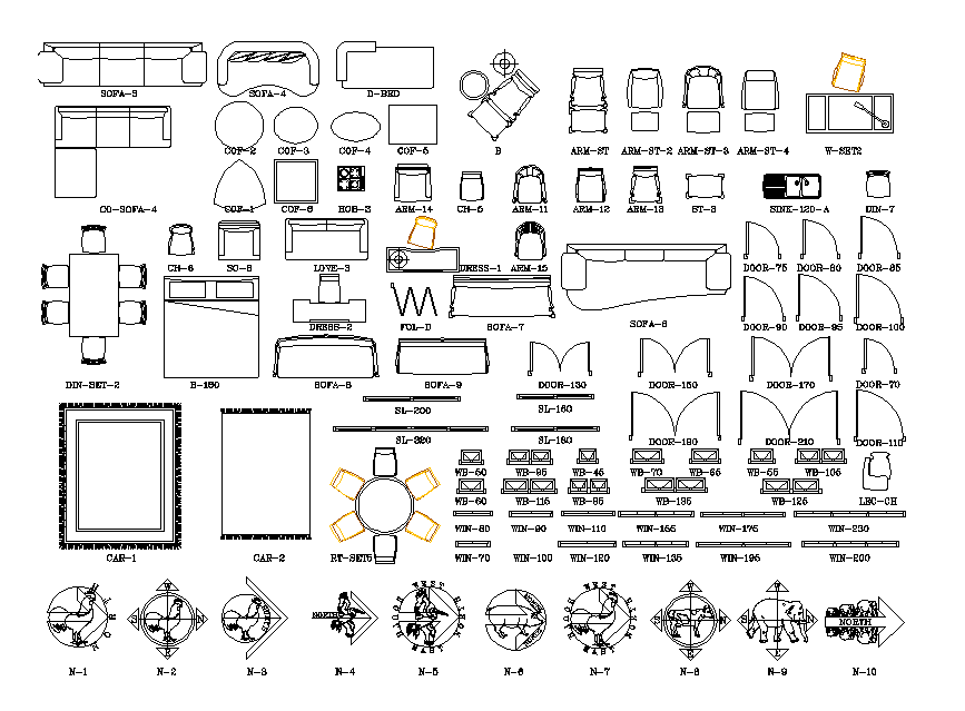 Furniture equipment plan. plan of items of furniture such as sofa set, arm-chairs, dining set, door, window, etc., The top view plan with different styles and sizes, according to one’s need.