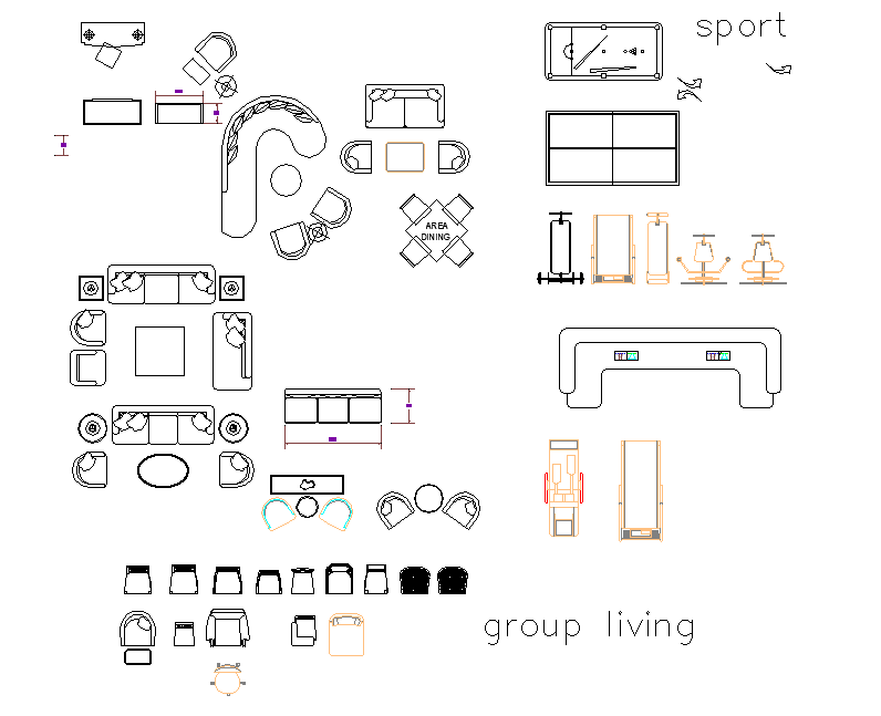 Plan of furniture equipment. The top view plan of sofa sets, arm-chairs, sports, etc., Plans with sections detailing.