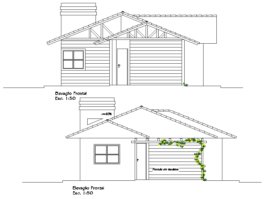 Elevation wooden house residence plan dwg file, front elevation detail, side elevation plan detail, scale 1:50 detail, furniture detail in door and window detail, landscaping detail in plant detail, etc.
