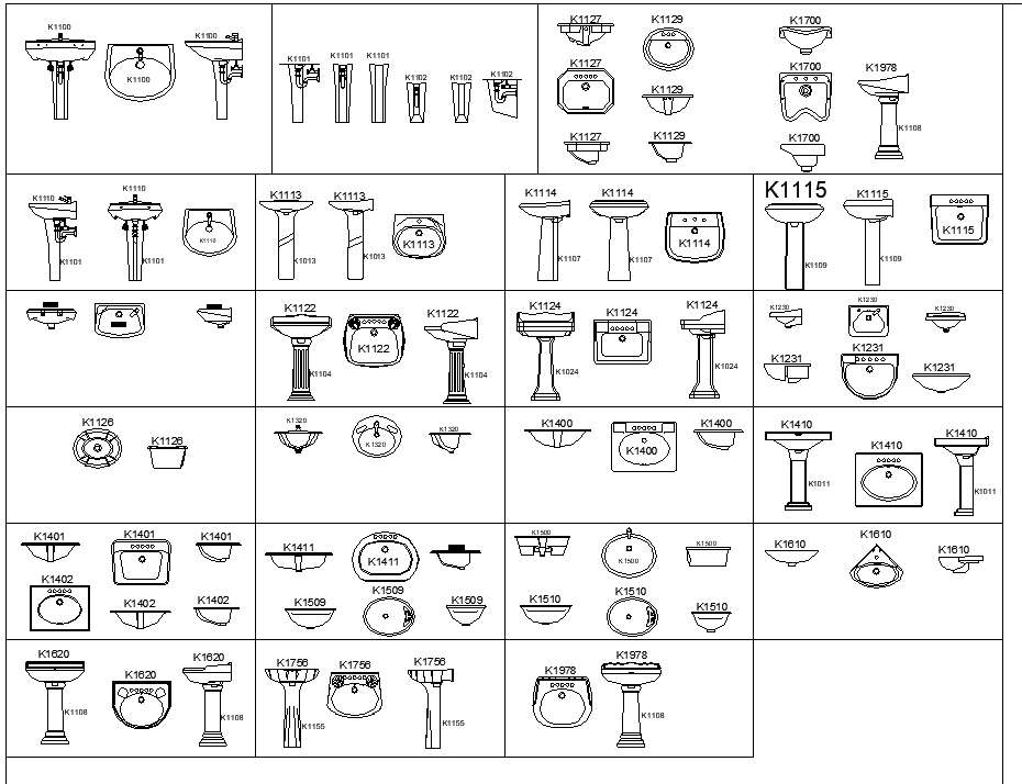 Bathroom equipment plan. The top view plan and sections of wash-basin. Different plans with different patterns and sizes.