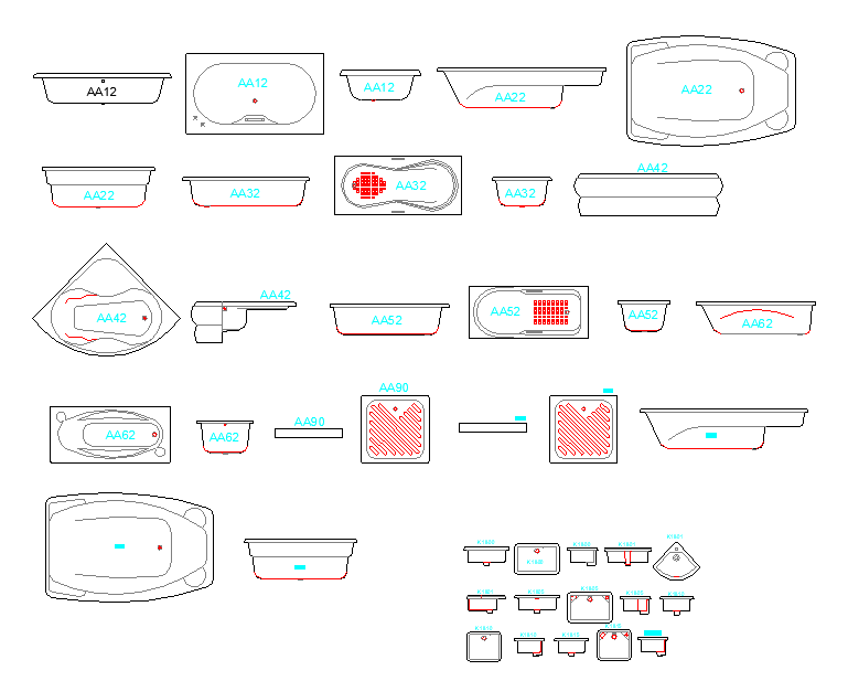 Plan of bathroom equipment. The top view, side view plan with different styles and sizes.