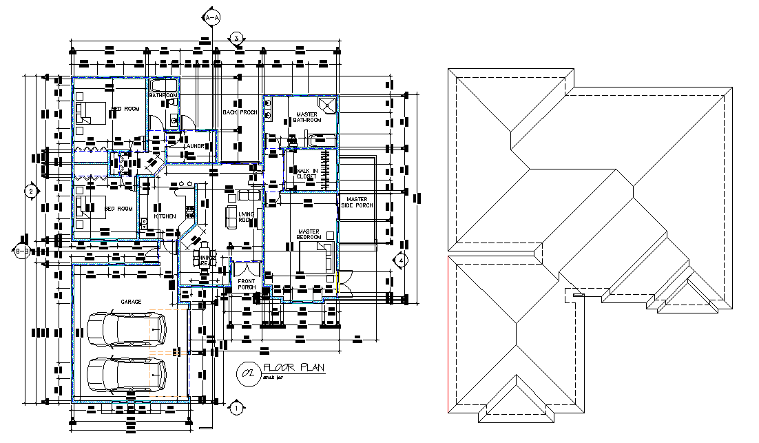 Floor and roof plan dwg file, section line plan detail, car parking detail, furniture detail in door, window, table, chair, bed and sofa detail, section line detail, centre line plan detail, etc.