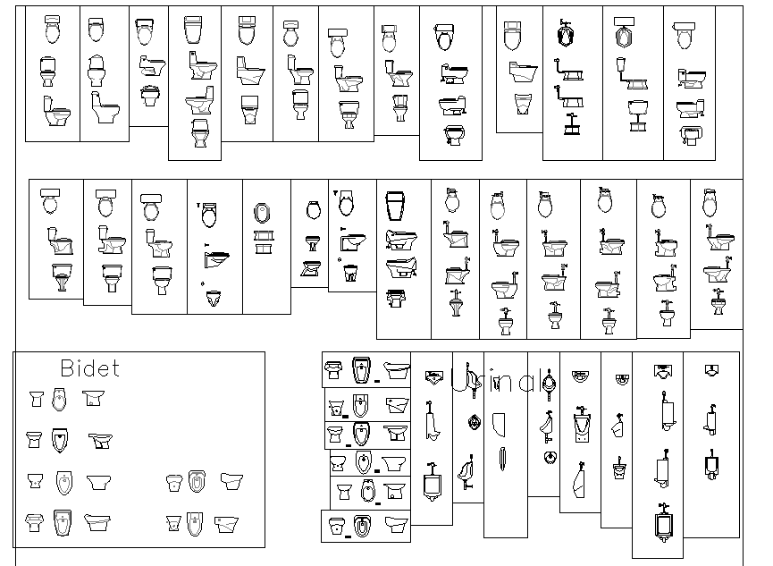 Bathroom equipment plan. The top view and side view plans of WC, etc., Different plans with different patterns and sizes.