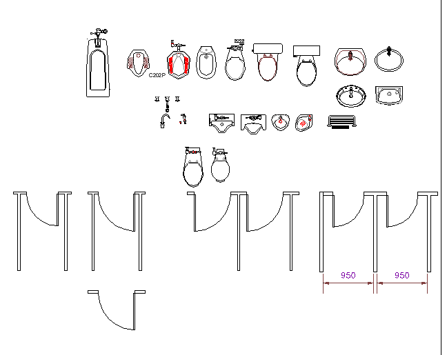 Bathroom equipment plan. The top view and side view plans of WC, etc., Different plans with different patterns and sizes.
