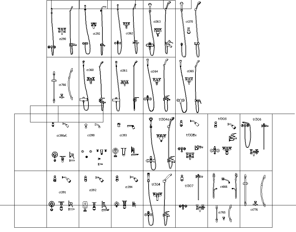 Plan of bathroom equipment. The top view, side view plan of a faucet, hand shower, etc., with different styles and sizes.