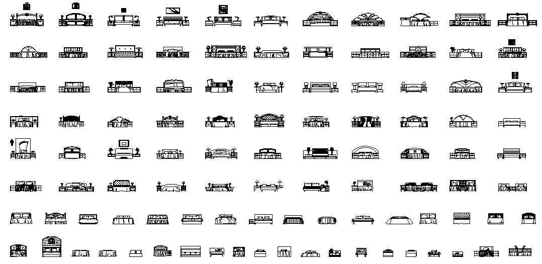 Bed front elevation dwg file. The front view of bed with different types of bed back rest, side units, pillows. Design with different style, cad block etc.