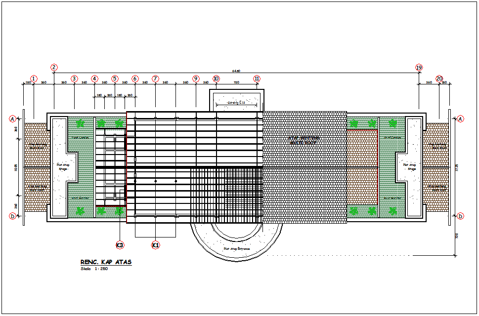 and view of wall and wall support view and view of roof multi tiles view,wall view,roof garden and stage view with designer circular entrance view with necessary dimension.