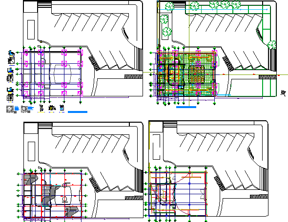 Bank floor general layout plan details that includes a detailed view of ground floor layout with landscaping and tree view, general layout plan of first floor, second floor and top floor and much more of bank floor plan details.