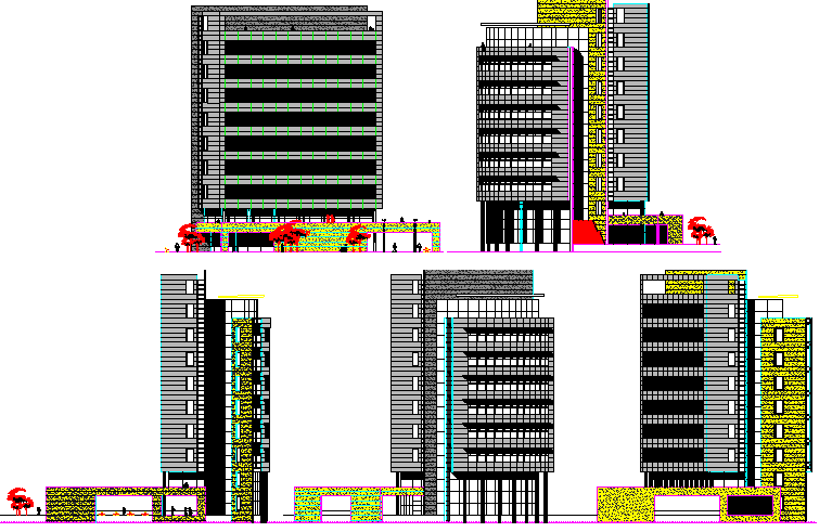 All sided elevation view details of multi-level corporate building that includes a detailed view of front and back elevations, side elevations, flooring view, doors and windows view, staircase view, tree view, car parking view, wall design and much more of building elevation.