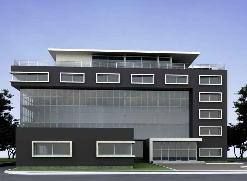 3d design of front elevation view of corporate office building that includes a detailed view of front view, flooring view, doors and windows view, tree view, glass wall, doors and windows view and much more of building design.