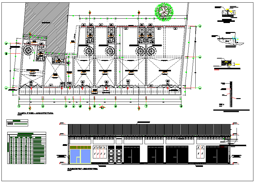 Commercial Gallery Lay-out & Elevation Detail. PROJECTION DOOR ENROLLABLE, Sliding Aluminum Window C / Glass, Metalic Rolling Door, protective columneta pipeline storm drain ø 4 ", detail of sanitary counterthrust, etc.