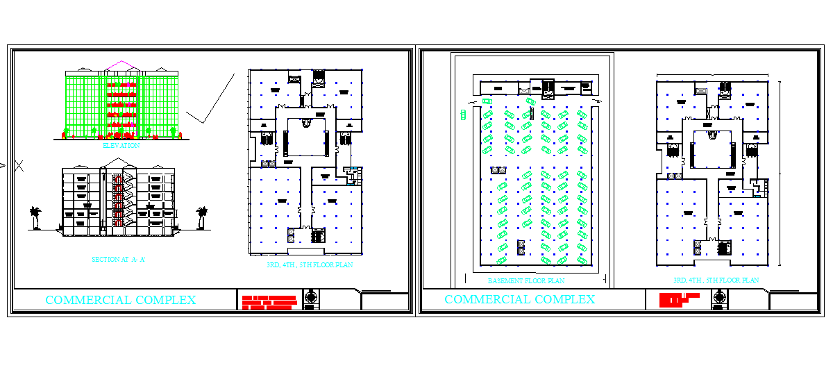 Commercial Complex & Basement Detail lay-out. 3,4,5 th floor plans., section and elevation of whole structure, basement floor 3,4,5 th floor plan, office spaces 670 sq mts, etc design.