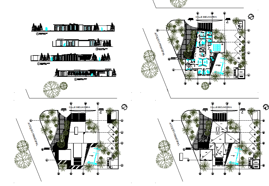 Clinic Floor Lay-out & Elevation detail. main access, games area, t. cisterna, secondary street, multiple use room, laboratory, s. emergency, s. external consultation
