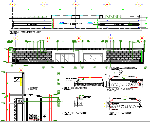 One story shopping center architecture details that includes a detailed view of front elevation, front sectional view, cut sectional view, doors and windows view, wall design, constructive details of column and beam and much more of shopping center project.