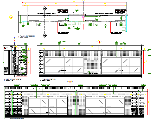 Main elevation and sectional details of shopping center dwg file