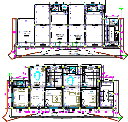 Floor plan layout details of two-story showroom that includes a detailed view of ground floor view, first floor view, indoor staircase view, dining area, general hall, billing counter, offices, departmental stores and much more of showroom project.