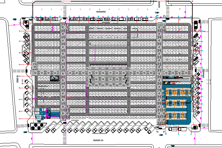 Market square architecture layout plan details that includes a detailed view of main entry and exit gate, indoor staircases, elevators, waiting area, seating area, corporate offices, commercial shops, shops and showrooms, departmental stores, sanitary installation, food stores, truck parking view, food stores, dining area, game zone, waiting area, cleaning department and much more of market project.