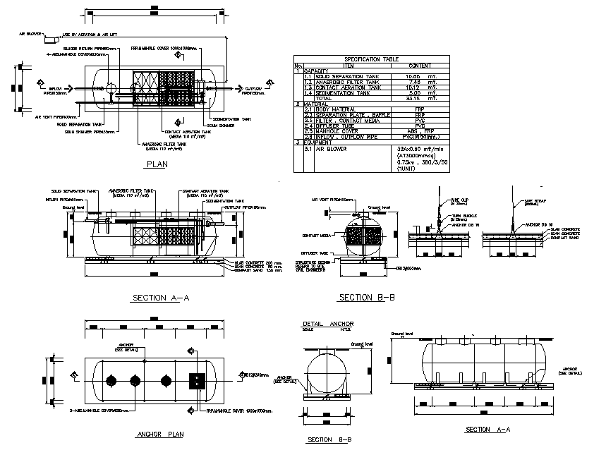Septic tank plan. The plan and sections with detailing of tank detail, material detail, equipment detail, etc.,