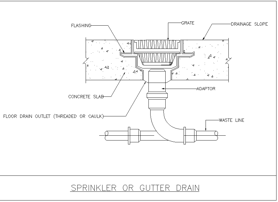 Sprinkler or gutter drain plan. The sections of a gutter drain with a detailing of a concrete slab, adaptor detail, drainage slope detail, great detail, outlet detail, etc.,