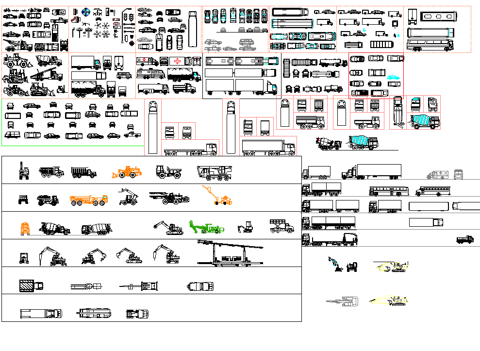 Vehicles and car blocks plan. The top view plans of different cars with elevations.