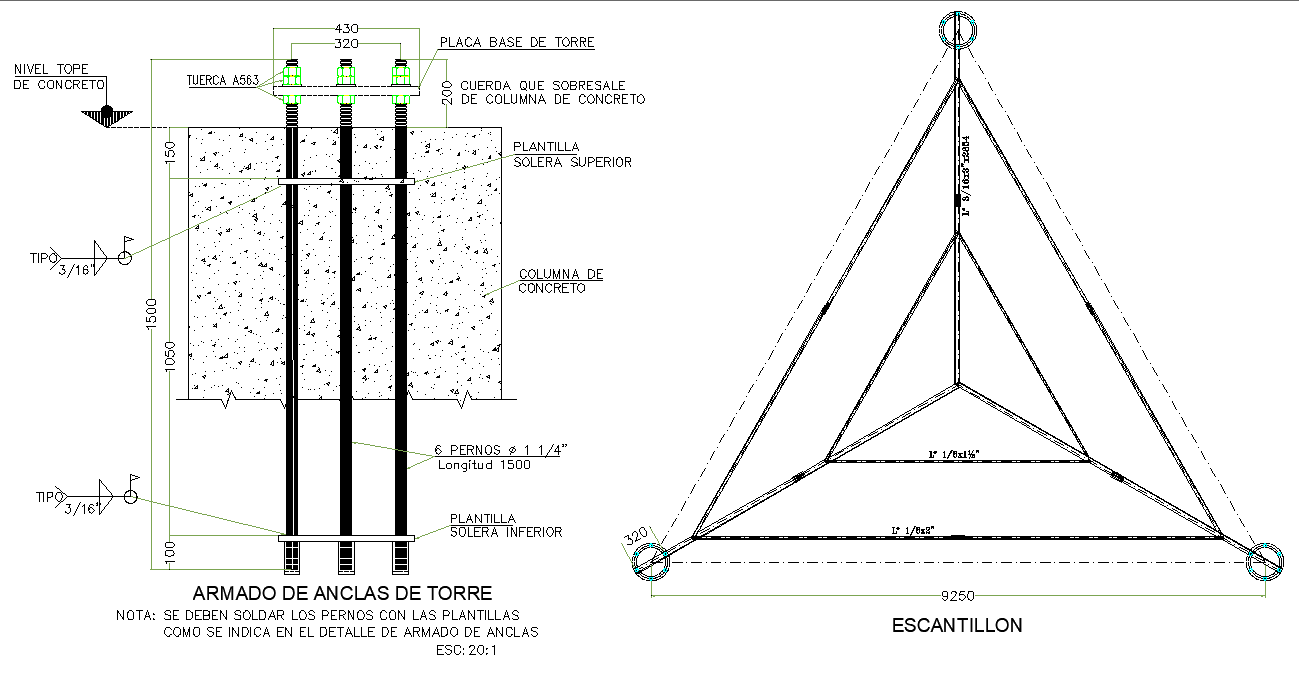 Armed tower anchors plan and section layout file, dimension detail, naming detail, reinforcement detail, concert mortar detail, etc.