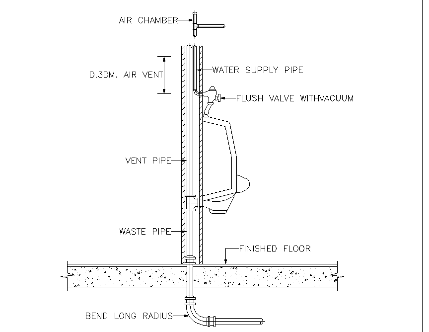 Urinal plan. The side elevation of urinal plan with the detailing of water supply pipe, pipe detail, floor detail, chamber detail, etc.,