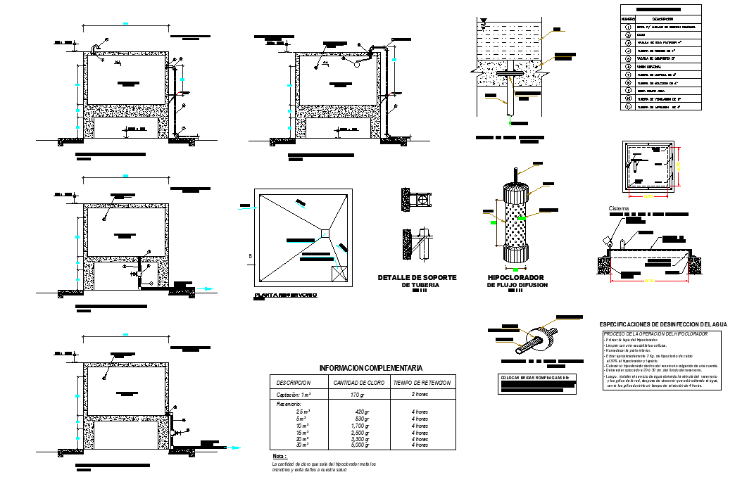 Sanitary facilities in elevated tank plan layout file, specification table detail, dimension detail, naming detail, bolt nut detail, etc.
