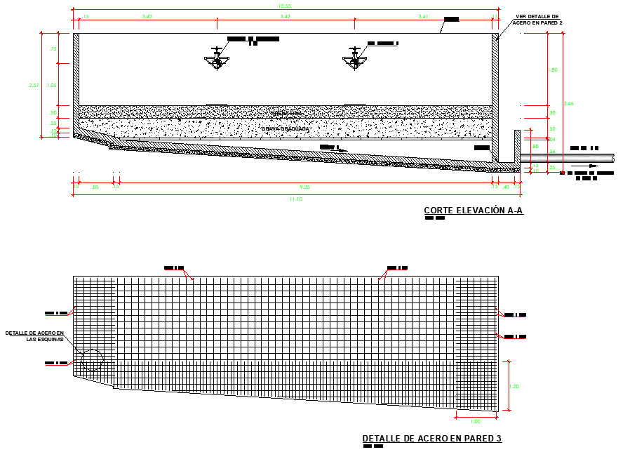 Tank plan and section layout file, dimension detail, naming detail, hatching detail, leveling detail, soil detail, etc.